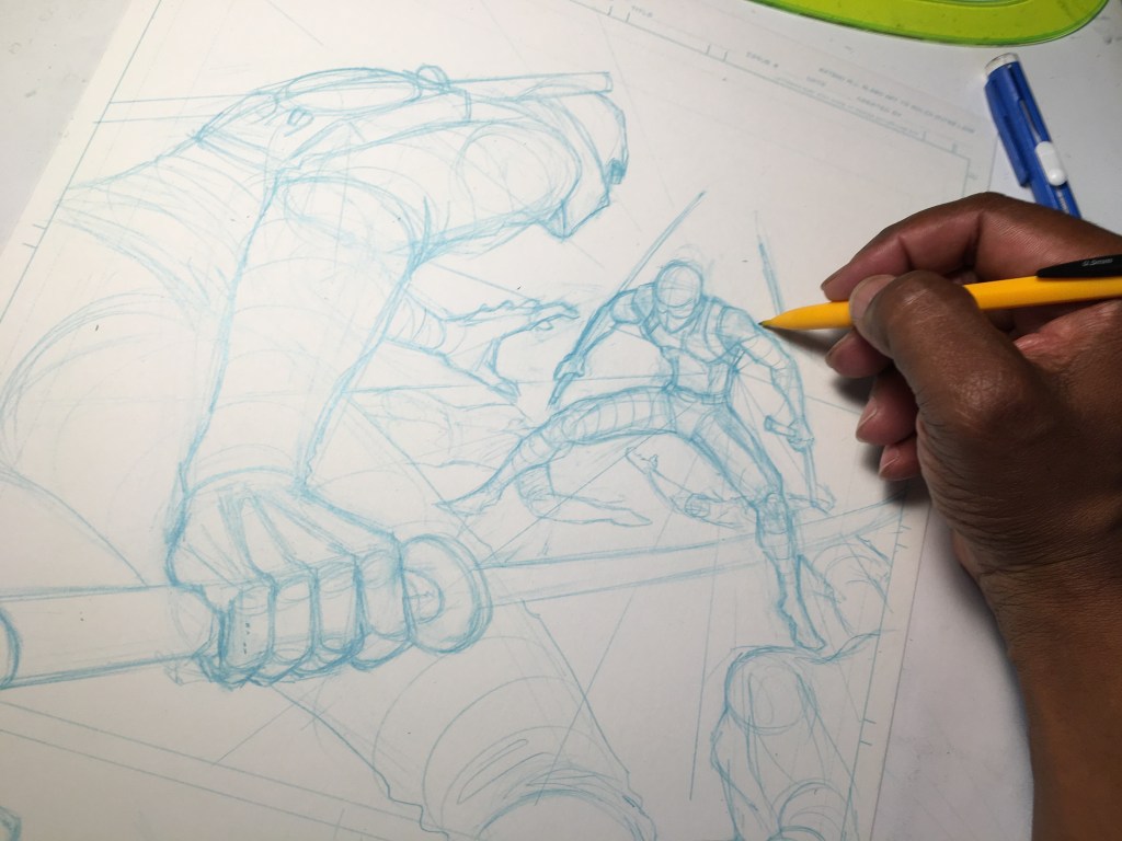 This is when I was sketching Jim Lee style. Rough it out, lightly erase, then go over it with clean pencil lines.