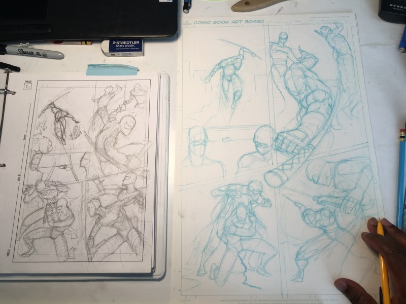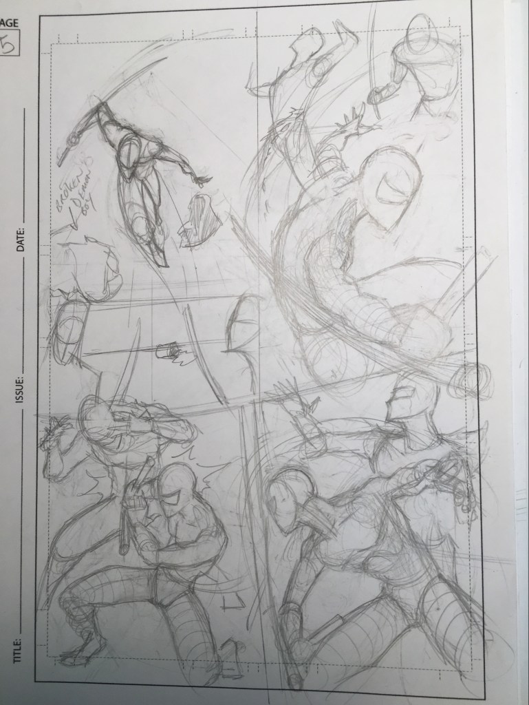 Once I have a majority of the pages completed. I start to detail it with more dynamic poses and set up the pages with numbers and a sequence.